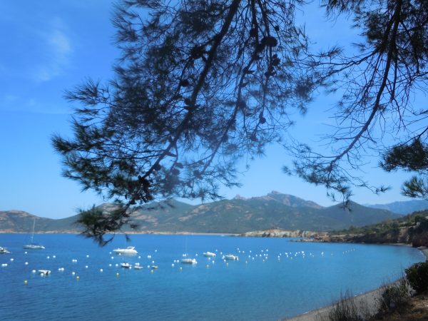 Nous nous détournons de la route d’Ajaccio pour aller me baigner sur la belle et grande plage de Galeria. Nous pique-niquons sur un banc sous un beau pin, d’un avocat, de deux œufs durs et de taboulé. Je suis la rangée de bouées jaunes qui délimitent la zone de baignade de la marina. De nombreuses bouées blanches offrent, en saison, des anneaux de mouillage pour les plaisanciers. Déjà en septembre il y en a fort peu.
