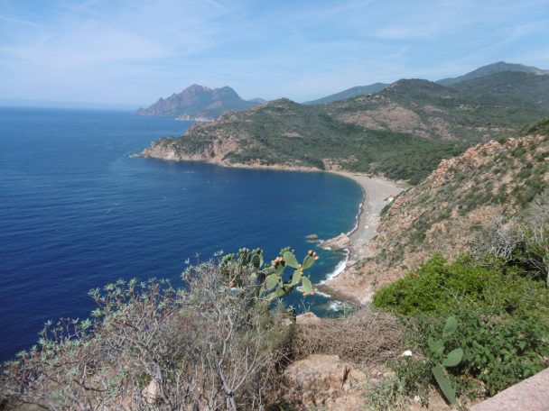 Je n’atteindrai pas Girolata, il est déjà 11h quand j’arrive sur la plage de Tuara occupée uniquement par deux couples et une vache. Un voilier mouille en face. Un garçon et une fille nagent nus. A les voir s’entortiller dans la serviette, j’en conclus que ce ne sont pas des naturistes mais plutôt des randonneurs qui n’ont pas de maillot de bain dans leur chargement. Je m’autorise une baignade d’une demi-heure. Je nage dans un décor splendide, un léger clapot agite l’eau mais rien de gênant pour se baigner.