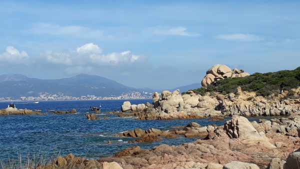 Nous faisons le tour de la presqu’île de l’Isolella à la recherche du sentier qui mène à la Tour génoise. Cette presqu’île est pittoresque mais beaucoup construite. Il faut guetter les échappées entre murs et haies qui cachent la mer. Par hasard, nous arrivons à la Punta di Sette Nave où des rochers granitiques sont – d’après une légende – sept navires envahisseurs pétrifiés. Des canoës et kayaks se faufilent entre les rochers d’un véritable chaos qui ferait penser à la Bretagne ou à la Sardaigne. Un gros zodiac libère des plongeurs en combinaison. Je découvre des criques minuscules puis monte à la tour en très (trop) bon état.