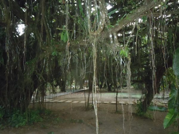 Le restaurant est sous un très haut toit pointu recouvert de chaume de feuilles de palmier, il est ventilé par deux hautes ouvertures triangulaires. Il y fait délicieusement frais. Après la pluie, les plantes ornementales ruissellent et les gouttes tombant du toit forme une fine cascade difractant la lumière. Cette humidité amplifie l’atmosphère tropicale. Le décor est raffiné : une bougie est posée au milieu d’un bouquet de fleurs rouges. Tagliatelle au saumon et tagliatelle aux crevettes roses servie avec des quartiers de citron vert, une herbe un peu acide comme de l’oseille.