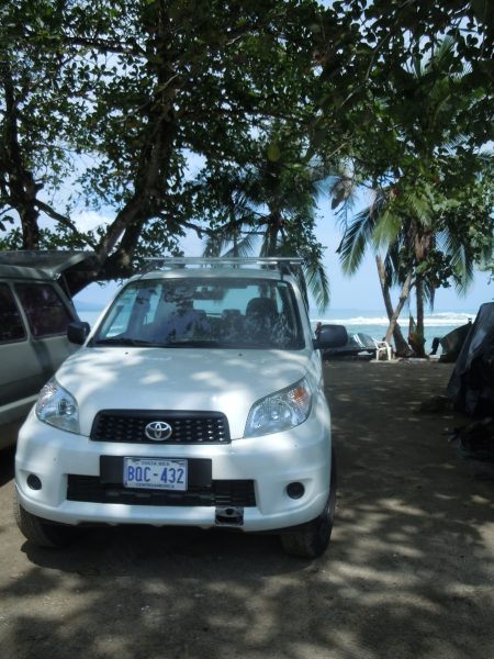 La voiture n’est pas là. Le loueur de Toyota était à l’heure. Il nous a attendu et s’est lassé. Il est rentré déjeuner chez lui. Les formalités se terminent à 14h30. Sur le Road Book, 3 heures de routes nous séparent de Puerto Viejo où nous aimerions arriver avant la nuit.