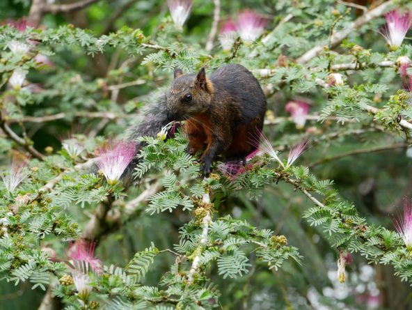 Tout en déjeunant, nous surveillons les écureuils sur l’albizia rose, sautant de branches en branches et disputant les bananes aux perroquets, hier. Ce matin, point de bananes, point de perroquet. L’écureuil snobe le régime qui reste d’hier et préfère s’intéresser aux fleurs de l’albizia formées de soies roses et blanches entourant les nectaires. Hier un colibri les avait butinées. L’écureuil arrache une fleur avec ses dents, la prend dans ses petites mains, la suce goulument et rejette étamines et pétales