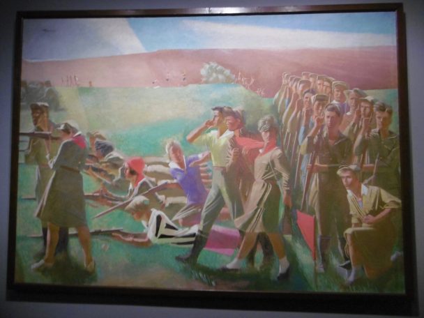 la dernière salle est décorée par des peintures historiques complètement kitsch représentant le cercueil de Lenine, Staline….et des films sont projetés à la gloire de Staline.