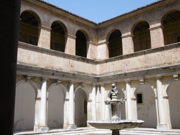 j’arrive dans un petit cloître entouré d’arcades de marbre blanc aux colonnes doriques accolées à des piliers. Sous les arcades, les dalles sont gravées. Au centre dune très belle fontaine de marbre est surmontée d’un ange/chérubin/petit amour ( ?) les sol est pavé de briques en arêtes de poisson. Une galerie de briques surmonte les arcades blanches ; Elle est peinte à fresques qu’on devine par les arcades. Malheureusement l’escalier est barré. Belle vierge très baroque.