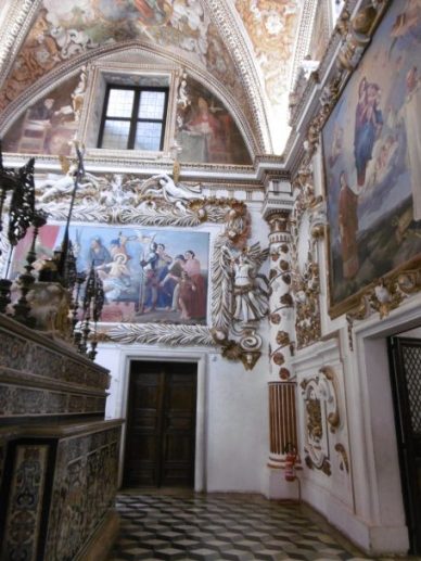 L’église s’ouvre sur ce petit cloître, séparée en deux par une clôture élégante de bois, toute en courbes et volutes, pour permettre aux laïcs et aux convers d’assister à la messe en même temps que les Chartreux.. Sur les côtés plusieurs chapelles et la sacristie communiquent entre elles. C’est en les traversant que maintenant les touristes pénètrent dans l’église des moines. Difficile de détailler la somptuosité du décor avec dorures et fresques au plafond, volutes et nuages baroques….Les chaires sont toutes marquetées de portraits de saints, de scènes ou de paysage comme nous l’avions vu à Naples dans la Chartreuse de Saint Martino. Les autels des chapelles et le grand autel sont réalisés en mosaïque de pierre dures (scagliosa). Le grand autel est encore plus majestueux avec des chandeliers précieux. La sacristie est meublée de placards en noyer.