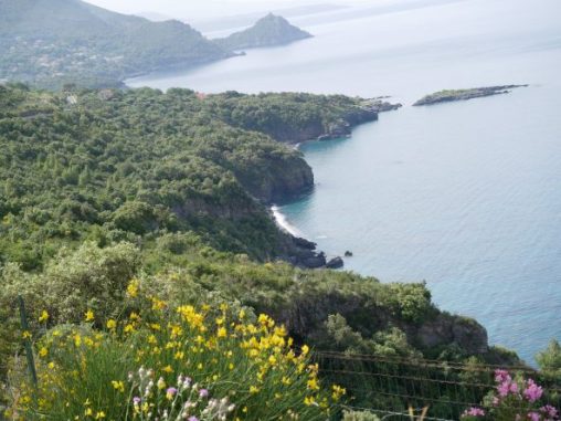 Le fleuve Noce fait la limite du Basilicate et de la Calabre. Nous avons quitté la Statale 16 perchée sur un haut viaduc pour entrer dans les agglomérations, Tortora puis Praia a mare, pas très chic si on compare à Maratea. Sur le bord de la rue des magasins vendent des articles de plage très ordinaires (3€ le parasol pour le pare-brise de la Polo, chez un Chinois) . Le lungomare n’est pas très brillant (ou plutôt il l’est trop) avec des installations voyantes aux couleurs criardes, des jeux pour enfants en structures gonflables, des centaines de parasols repliés aujourd’hui qui n’attendent que la saison pour se déployer et cacher le sable. Cela ne fait pas tellement envie.