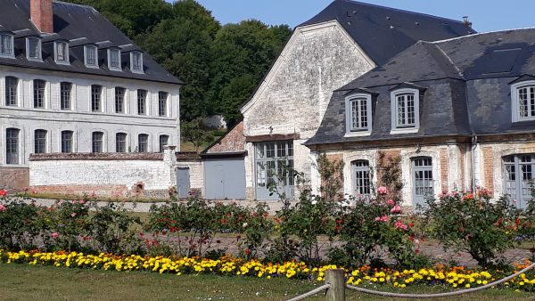 Nous garons la voiture sur un parking ombragé devant les grilles de l’Abbaye. Les bâtiments sont construits en arc de cercle. Ceux qui sont proches de la grille sont fleuris de roses. A l’arrière d’un parterre se trouve une élégante construction XVII – XVIIIème siècle.