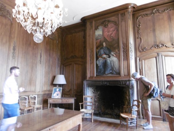 Le grand salon est lambrissé et parqueté de chêne. Les boiseries l’œuvre du baron autrichien Simon-Georg von Pfaffenhofen (1715-1784) réfugié à l’abbaye à la suite d’un duel, et sculpteur habile.