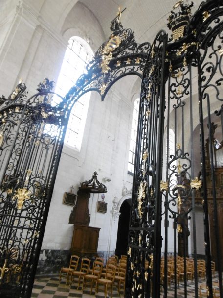 L’église baroque et rococo fut aussi ornée par les sculptures de Simon Pfaff qui réalisa le buffet de l’orgue énorme qui fonctionne encore. La grille, faisant office de clôture, fut réalisée par le ferronnier Jean Baptiste Veyren . Le conférencier décrypte pour nous les symboles qu’elle contient : le blason de l’évêque et les poires, symboles de la prospérité de l’Abbaye. On y confectionnait un alcool de poire réputé qui était exporté. Simon Pfaff décora le maître-autel en marbre et en plomb doré. Autant le reste du couvent est sobre, autant l’église témoigne d’une mise en scène extravagante : la crosse eucharistique avec le ciboire suspendu à la crosse à 3 mètres du sol avec des anges en papier-mâché – autrefois polychromes. Au plafond est représenté une morille, allusion à la fondation de l’abbaye dans un champ de morilles.