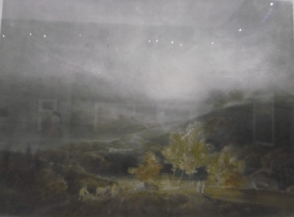 Devant ce paysage brumeux il faut prendre son temps. La lumière surgit dans le creux de la vallée dans un ciel gris bleu. Si on est attentif on découvre une habitation sur le bord du lac, la silhouette fantomatique d’une tour carrée, donjon ou clocher? Au premier plan dessin d’une grande finesse d’un groupe d’arbres roux. Deux personnages,  deux paysans avec leurs attelages labourent.