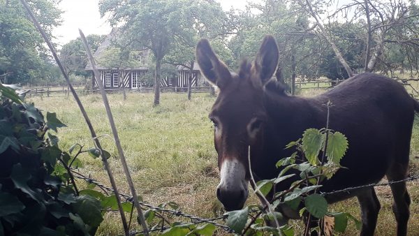 A notre arrivée un très grand chien gris aux longs poils se lève. C’est un lévrier irlandais : Pomme, très gentille mais impressionnante.