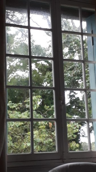Notre chambre, Séquoia, a deux lits jumeaux et une belle salle de douche. Située à l’angle du bâtiment, elle possède deux grandes fenêtres habillées de double-rideaux gris clair et soulignées par les volets pliants bleu-vert d’eau. De mon lit, je suis fascinée par les arbres géants qui se dessinent derrière les petits carreaux. A l’arrière-plan,les branches tortueuses, puis le feuillage léger d’un frêne, plus près un marronnier aux épaisses feuilles et plus proche l’arbre de Judée vert tendre. Je regrette d’avoir oublié mon matériel de dessin.