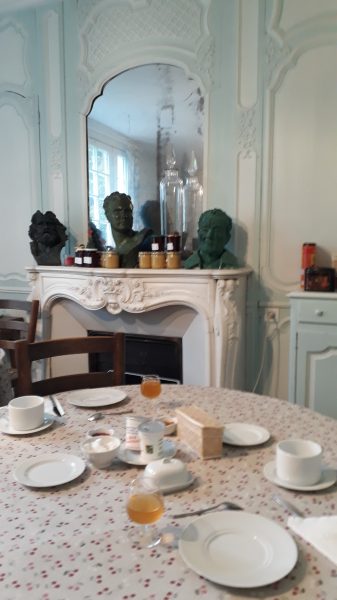 Le petit déjeuner est servi dans la belle salle à manger avec glaces et moulures. Pots de confitures maison. Bustes et têtes en terre et en bronze. Nous logeons chez des artistes sculpteurs. Jolie vaisselle, pain frais et chouquettes. yaourts Blonvillais, produits dans une ferme toute proche, excellents.