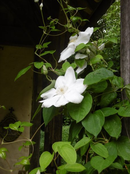 J’arrive dans un labyrinthe bordé par un mur et trois petites guérites carrées abritant des statues : Saint Michel terrassant le dragon, Vierge et Saint Fiacre, patron des jardiniers. Ce parcours initiatique me conduit à l‘Oratoire dans la senteur des roses blanches. Une douce musique s’élève. Une liane s’enroule dans un coin, passiflore blanche que j’ai confondue avec une clématite. La symbolique mystique est redoublée par la présence de l’olivier et du figuier, arbres chargés de spiritualité. Les agapanthes annoncées ne sont pas encore fleuriez .