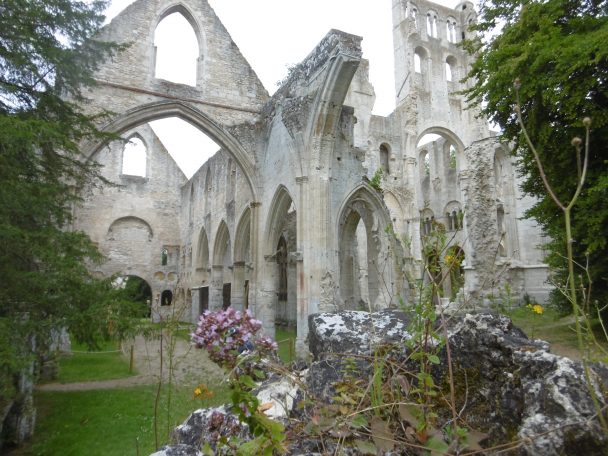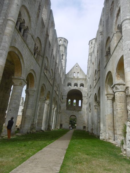Nous quittons l’autoroute A13 à Pont-Audemer , passons par la Mailleraye et le Pont de Brotonne. je suis étonnée par les forêts que nous traversons dans les Boucles de la Seine : hêtres de taille imposante, chênes et conifères. Après avoir traversé la Seine nous longeons le fleuve dans un paysage étonnant mi-agricole, mi-industriel. Interminable traversée d’un bourg : Le Trait avant de trouver Jumièges et son abbaye ruinée mais très imposante.