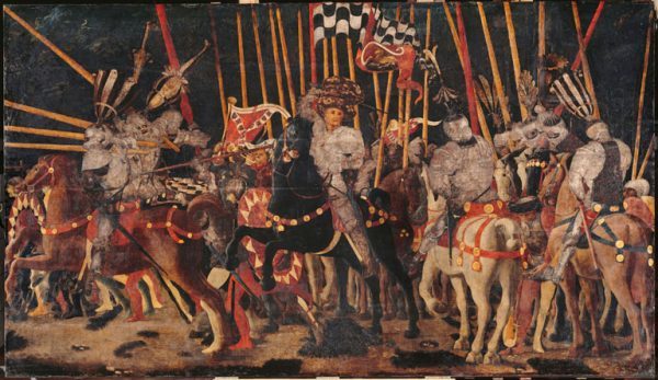 Je remarque d’abord la Bataille de San Romano d’Uccello (1440-1445), composition extraordinaire ds lances et des pattes des chevaux où seul au milieu Micheletto da Cognole coiffé d’un turban se détache sur des anonymes chevaliers en armure.