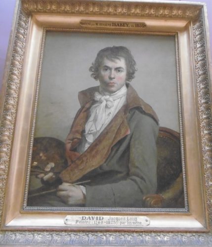 Autour et en face, le tableaux historiques et romains de David : Les Sabines arrêtant le combat( 1799), Léonidas aux Thermopyles (1814), Le serment des Horaces (1784), Les licteurs rapportant à Brutus le corps de ses fils (1789). Ces tableaux néo-classiques donnent une ambiance héroïque et martiale qui s’accorde avec l’épopée napoléonienne glorifiée par le Sacre. En traînant dans les coins, en s’attachant aux plus petits tableaux, je découvre un Sommeil d’Endymion de Girodet, avec un éclairage presque caravagesque et une ambiance pré-romantique. David se révèle également un excellent portraitiste Avec le Portrait de Pierre Sérignat (1795) et d’Emilie Serignat. Un peu de fraîcheur dans cette solennité romaine virile. La plus grande tendresse est apportée par l’autoportrait d’Elizabeth Vigée-Lebrun en compagnie de sa fille. J’ai aussi aimé l’autoportrait de David. Face au Sacre : la très célèbre Madame Récamier. Autant les scènes historiques, romaines et le Sacre me laissent froide, autant je suis touchée par David portraitiste.