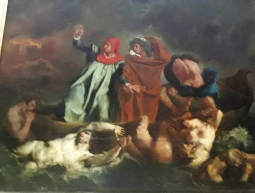 Dante et Virgile aux enfers(1822) est exposée à côté de la Liberté. Pendant que j’essaie de cadrer avec mon smartphone la barque de Dante, passent deux personnages, père et fils habillés d’une harmonie parfaite de jaune rouge et noir, (belges ou allemands?) Papa porte en bandoulière un téléobjectif de photographe animalier. Et que vise-t-il? non pas la Liberté qui ne nécessite pas un tel équipement, mais son fils en plein devant le tableau, en masquant un bon quart. Chercher le spectacle dans les œuvres exposées, dans leur décor et aussi parmi les visiteurs!
