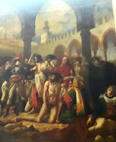 La Galerie Mollien est la réplique symétrique de la Galerie Daru qu’on vient de quitter : même rouge sang, même disposition. Si la première tournait autour de David, dans la Galerie Mollien, Géricault et Delacroix en sont les vedettes. Gros illustre les campagnes napoléoniennes, La visite de Bonaparte aux pestiférés de Jaffa, m’intéresse, j’aurais pu utiliser la photo pour illustrer Turbans et chapeaux de Sonnallah Ibrahim qui raconte cette anecdote ; cela me fait aussi penser à la visite à Beyrouth de notre Président(quelle coïncidence!). Son portrait de Murat chamarré aurait pu figurer dans mon billet relatant la visite à la forteresse aragonaise de Pizzo en Calabre où il a finit sa vie.