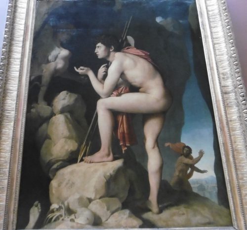 Plus avant dans la galerie, apparaissent d’autres artistes : Ingres et Gros. Ingres s’inscrit aussi dans la peinture antique avec Oedipe explique l’énigme au Sphinx (1808) et avec le très grand tableau d‘Homère déifié. Bien sûr, sa grande odalisque est à l’honneur.