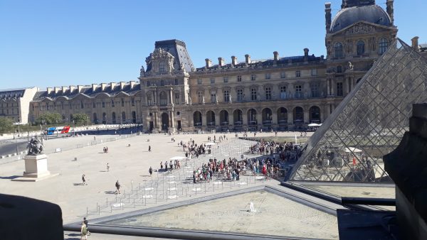 Jeanne d’Arc d‘Ingres et Suzanne de Chasseriau gardent la porte de sortie de la Gallerie Mollien. Nous parvenons alors dans un autre salon carré : Le Salon Mollien occupé par une belle cafeteria : self service avec les fenêtres qui regardent les Tuileries et l’Arc de Triomphe du carrousel. Côté cour et pyramide, une belle terrasse est installée au dessus du bassin et un petit jet fait un bruit rafraîchissant . Surtout, être à l’extérieur à une terrasse de café permet d’ôter un moment le masque. Qui sont les personnages géants debout dont je ne vois que le dos?