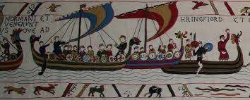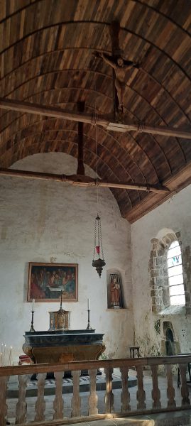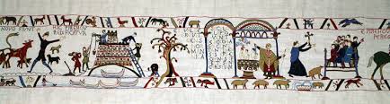 A l’instar de la Tapisserie de Bayeux qui raconte la conquête de l’Angleterre, la tapisserie de Pirou raconte l’arrivée des Vikings dans le Cotentin et la conquête par les Normands de l’Italie du Sud et de la Sicile. C’est une histoire que j’ai étudié l’an passé lors de notre voyage dans les Pouilles et en Calabre. Comme la Tapisserie célèbre, une longue bande brodée se déroule sur les murs de la pièce. mais ce n’est pas une oeuvre du XIème siècle, elle a été brodée 1976 et 1992 par Thérèse Ozenne qui a étudié la tapisserie de Bayeux pour reproduire les mêmes points à l’aiguille.
