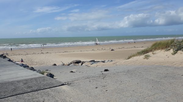 Quelques kilomètres plus loin vers le nord, une belle route conduit à une grande rampe en ciment qui traverse la plage, à côté il y en a une plus courte. Probablement pour la mise à l’eau de bateaux ou pour la descente ds tracteurs des conchyliculteurs? La mer a baissé, laissant une large étendue de sable mouillé. Aucune trace de bouchots ou de parcs à huîtres à l’exception des coquilles quand j’arpente le sable d’une finesse très agréable sous mes pieds. Dominique a perché le siège « metteur en scène » sur la rampe. Une méhari blanche arrive avec tout un mécano de tiges et de roues qu’un homme déplie. En quelques minutes on reconnaît un char à voile.