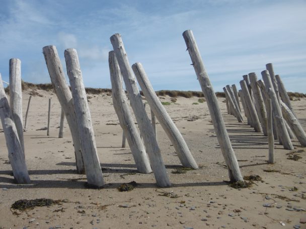 Une file d’enfants suivant leurs moniteurs arrivent sur le sable. Étrangement, ils sont tous noirs. Suis-je transportée au Sénégal? Ils sortent du VVF voisin installé sous de grands thuyas beaucoup plus agréable que les villas étriquées de Coutainville-Agon, traversées ce matin. On a planté deux rangées de pieux sur le sable, ou plutôt des poteaux du diamètre d’un gros arbre.Protection de la dune et de la plage de sable?Fortifications de la seconde guerre mondiale? Conchyliculture? Aucune explication.