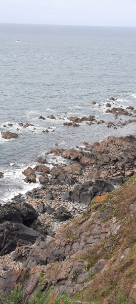Le GR arrive dans l‘anse de Sciotot : grande plage de sable avec des bancs rocheux, schistes et cornéennes. je descends chercher des galets à grenat, sans en trouver; je tenterai ma chance à Dielette.