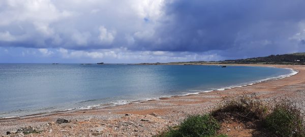 Pour pique-niquer nous choisissons l’ Anse Saint Martin, plage de galets abritée à l’eau étonnement transparente et tranquille : pas une vague. La limpidité est sans doute expliquée par la présence de galets. L(au est tentante : un jeune allemand sort d’un camping car et fait la planche, puis une dame.