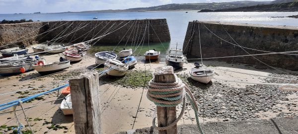 Ce midi, à marée basse, les barques reposent sur le sable. Tout un système de cordes tendues entre les deux jetées les retiennent.
