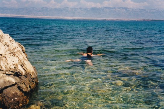 Nous resterons toute l’après midi sur notre terrasse. Le supermarché vend des masques de plongée. J’en achète un bon marché (pas très étanche) et j’ai le plaisir d’observer des tas de poissons. Certains sont minuscules, transparents et nagent en groupe en surface. D’autres plus gros broutent les algues. Je crois même reconnaître des rascasses. Heureusement que nous nous baignons chaussées. Notre parasol fournit une belle ombre, le vent souffle de la mer, il fait une température délicieuse. Dominique surveille les évolutions d’un groupe de jeunes : 3 jeunes filles jolies et agréables, 3 petites filles adorables en deux pièces. Puis arrive une allumeuse qui attire tous les garçons. Avec mon masque je ne me lasse pas de retourner à l’eau. Nous levons le camp à 17h30. Nous faisons un crochet par Zadar pour nous approvisionner à Billa.
