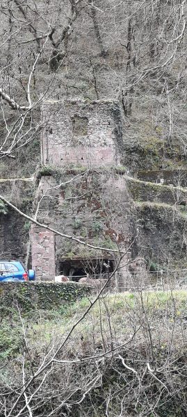 A l’entrée de Banca contre la falaise noirâtre, un canal, et les ruines d’un établissement industriel. Le Centre d’Interprétation du Patrimoine minier se trouve au milieu de village 300 m plus haut, fermé. Dommage, je me passionne pour ces sites industriels et ces musées racontant ces techniques anciennes et les conditions de vie des ouvriers. Un circuit libre dans le village avec des panneaux explicatif me permet de découvrir le site. Les mines de cuivres furent exploitées depuis le temps des Romains. Les filons affleurent sur le versant en face. Les pierriers sont  les déblais des stériles évacués par les mineurs de l’Antiquité. Une fonderie de cuivre fut créée en 1746 par un Suisse exploitant les filons cuprifères. Cette exploitation avait une renommée nationale en France qui manquait de cuivre. Cette fonderie fut anéantie en 1793. De 1825 à 1860 un haut fourneau était alimenté par du minerai venant du nord de la vallée, le combustible était le bois des forêts. Les marteaux étaient actionnés par l’eau du canal. La bâtisse était longue de 80 m de haut. On peut encore observer le haut-fourneau.