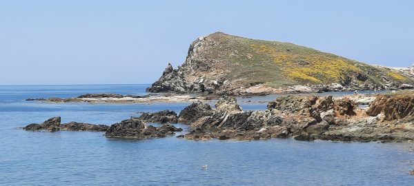 Nous boirons le bitter au pied des moulins au Belvédère des moulins. Deux moulins sont en ruine et ont perdu leurs ailes, un troisième a été trop restauré avec un crépi blanc (comme les moulins grecs) il a perdu son authenticité et son charme. Le village de Centuri ressemble à sa voisine Morsiglia avec ses tours rondes et carrées. A Ersa il faut quitter la D80 pour rejoindre le petit port de Barcaggio à l’extrémité nord du Cap. La petite route est si discrète que nous la dépassons. Je demande à Madame GPS qui propose un circuit de 36 km alos que Barcaggio se trouve à peine 7 km d’Ersa. Demi-tour hasardeux. Heureusement àh les gens sont à table et la route est vide. Barcaggio est un tout petit village avec un petit port et quelques restaurants, deux tours génoises et une belle plage de sable blanc. Pour déjeuner nous choisissons un coin sauvage au-dessus du sentier côtier. Les schistes du bord de mer sont blanchis, la végétation est rase, thym fleuri et plantes grasses.