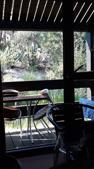Arrivée à la Résidence Castell’ Verde. L’hôtesse est charmante. Elle nous a surclassées pour éviter des marches supplémentaires à Dominique. Pas de gaspillage de papier : il faut scanner le QR code, tant pis pour qui n’a pas de smartphone ! Résidence 3*, à flanc d’une colline arborée plantée de pins parasols, de mimosas, eucalyptus et divers arbustes. Les bâtiments sont en bois foncé, 1 étage et des balcons assez vastes pour contenir une grande table assez vaste pour y déjeuner à 6 et un étendoir pour les serviettes et le linge. Le balcon est ombragé par un toit de planches à claire-voie.