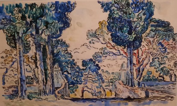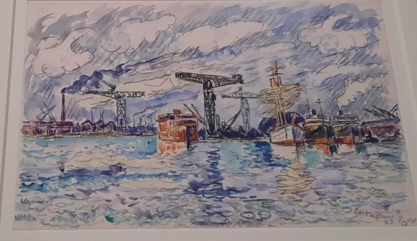 parfois le peintre choisit de croiser les touches, parfois de jouer le mosaïste avec des touches carrées ou rectangulaires qui ressemblent à des tesselles. Cette exigence de couleurs pures suppose un travail préparatoire. Si la peinture sur le motif, comme les impressionnistes, est le début du tableau celui-ci sera accompli en studio. l’exposition présente donc de nombreuses études préparatoire, huiles en large touches très colorées et petits format, ou grands lavis à l’encre de Chine de la taille du tableau définitif en couleur.