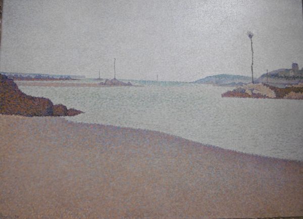 Tout d’abord,  nous étudions les recherches de couleurs, la palette éclatante de Signac, les complémentarités des couleurs, l’utilisation de couleurs pures qui ne doivent pas se mélanger mais se rehausser, s’exalter. On parle parfois de pointillisme ; à y voir de plus près, ce ne sont pas des points (il y en a comme les points orange de l’Opus 176 qui rehaussent les barques bleues ou les arbres verts) mais il y a aussi ces virgules roses et bleues, éclairant la mer de Saint Briac