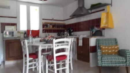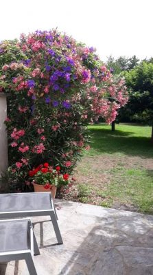 Notre logeur nous a donné rendez-vous au rond-point, pourtant le gîte est facile à trouver le long de la T10 à Casamozza bien indiqué par une pancarte verte et le logo des Gites de France. Trois gîtes sont alignés sur une très grande pelouse plantée de beaux mûriers, quelques oliviers et un pêcher qui porte de belles pêches mûres. De gros buissons de lauriers roses pour la couleur. Des ipomées poussent sur les lauriers roses mêlant leur corolles violettes aux bouquets roses. Trois gîtes alignés mais bien séparés. Sur notre terrasse une belle table 6 chaises noir sous un auvent pour le soleil et même la pluie. A l’intérieur, il fait très frais (volets fermés). La pièce à vivre est une très grande salle avec une cuisine américaine. Absolument tout le confort, une télévision XXL, un canapé confortable, tous les ustensiles de cuisine, une très grande salle d’eau avec une machine à laver le linge. Après la « cabine de bateau » nous nous sentons au large !