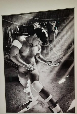 Dans de petites salles rouges des écrans vidéos en couleur donnent la parole aux Indiens, qui dénoncent très clairement le désastre qui se profile : les rivières polluées par les orpailleurs, les épidémies propagées par les routes qui pénètrent leur forêt, le changement climatique déjà perceptible avec le dérèglement du régime des pluies, la chaleur sèche. Ils nomment Bolsonaro comme responsable de l’aggravation de la catastrophe. De nombreuses photos donnent une idée de la diversité des populations, des costumes, des peintures corporelles. Certains n’ont aucun contact avec la civilisation moderne, d’autres ont eu des échanges avec les civilisations précolombiennes. Tous sont unanimes, la forêt est en danger et ils veulent la défendre.