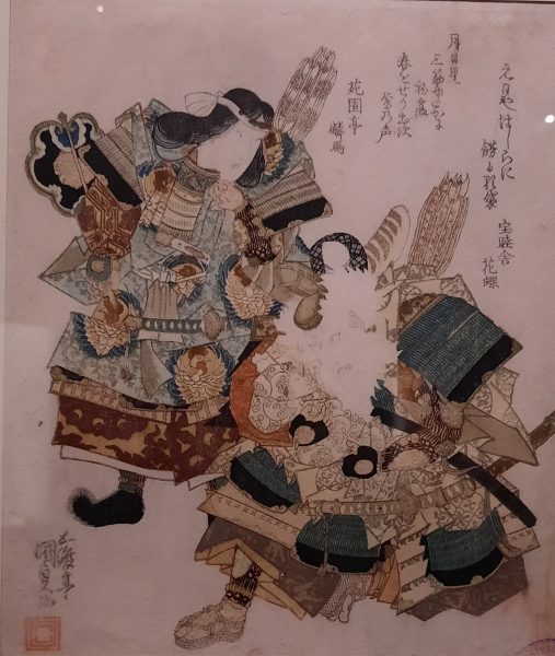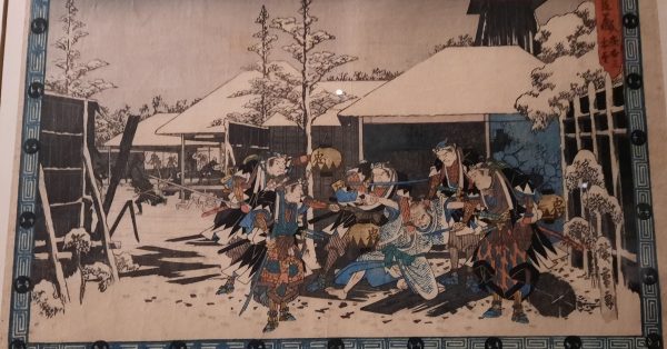 L’Histoire des 47 Ronins occupe toute une salle. Basée sur un fait historique 1703 avec le suicide par éventration (seppuku) d’un maître suivi de celui des 47 disciples. La série d’estampes raconte cette histoire : « Le théâtre des vassaux fidèles » avec de nombreux épisodes et luxe de détails aussi bien dans la représentation de combats que dans la vie quotidienne. elles sont l’œuvre de Uttagawa Hiroshige (1797-1858)