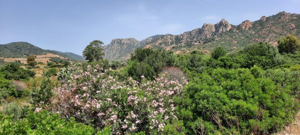 Plus bas, nous trouvons la route de Murtas. La Cala Murtas eset une plage vierge appartenant au Polygone militaire mais ouverte en été. Il faut parcourir environ 5 km à travers des terrains militaires. La route et libre d’accès mais il ne faut pas en sortir. Des montagnes rouges barrent la route vers le nord rappellent par la couleur des roches, et la végétation, les montagnes de l’Estérel. La végétation luxuriante et fleurie, lauriers roses, cistes jaunes, lavande des maures, blanches ombellifères forment un tableau multicolore.