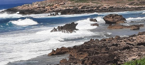 Des agaves se détachent sur la mer. Les vagues s’engouffrent dans l’arche, se fracassent sur les rochers à grand bruit. C’est spectaculaire Deux escaliers descendent à une plage minuscule qu’une famille à elle-seule a colonisée avec un drap de bain et une piscine d’enfants gonflable. D’autres personnes arrivent , ils vont devoir se replier et se tasser !