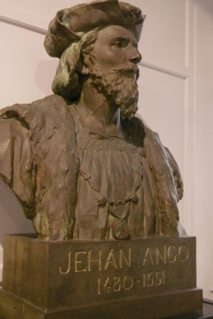 Jehan Ango (1480 -1551) fut le premier armateur de Dieppe. Il a affrété des expéditions en Amérique, Antilles, au Brésil, en Guinée, Inde, en Chine. Il a possédé jusqu’à 70 navires. Pirate, il a reçu de François 1er une « lettre de marque » l’autorisant à piller les bateaux espagnols et portugais. A son décès, François 1er lui a laissé des dettes, Ango ayant perdu sa fortune et son protecteur acheva sa vie, ruiné, au manoir. Ango est une figure importante encore maintenant à Dieppe : le pont levant est à son nom, son buste a sa place au Château de Dieppe.