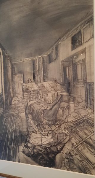 Nous découvrons d’abord d’intéressantes études au fusain de son atelier. chaos très étudié de cadres, châssis, chevalets. En regardant plus attentivement on découvre le dessinateur à sa table, parfois seulement ses deux mains dans un coin. Allongé il se repose…Grande précision ans le dessin.
