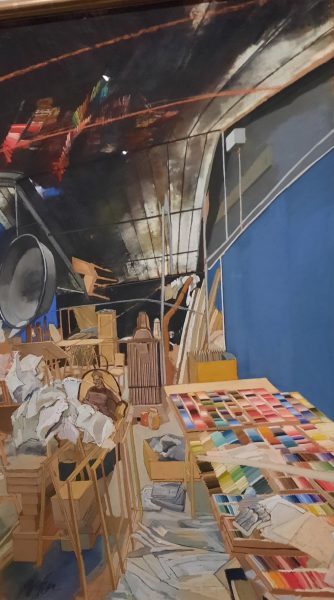 La salle suivante réunit des études de son Atelier de la rue Crussol, le titre est Le chaos apprivoisé. Avec les pastels, la couleur fait irruption dans ces études d’atelier où il décrit sa vie quotidienne, ses outils avec des gammes de couleurs dans ses boites bien rangées de pastels.