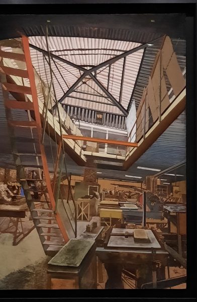 Ancienne fabrique de lithographie cette imprimerie fut un lieu important dans les années 1970. Szafran dessine les volumes de la verrières, les escaliers, les machines sous différentes perspectives. on peut voir les ouvriers au travail.