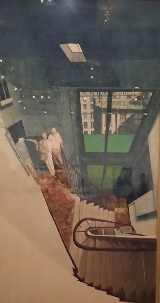 Dans l’escalier, des personnages découvrent le monde extérieur. le paysage fait irruption dans le tableau