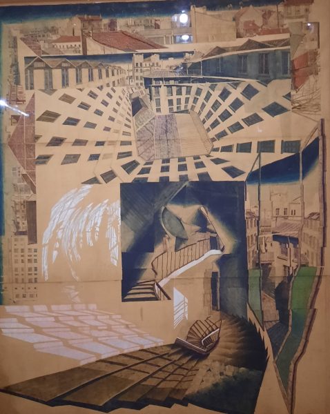 L’escalier est un thème qu’il a déployé de manière cinématographique : les différentes perspectives sont vertigineuses et suggèrent une déformation de la vision. C’est l’escalier du 54 rue de Seine, siège de la Revue poétique La Délirante . Il dessine aussi des personnages coincés et dans une illusion d’optique.