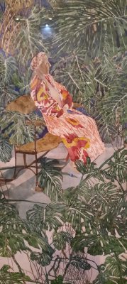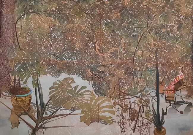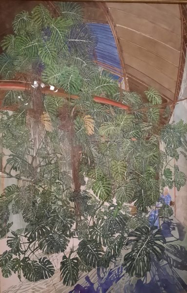 C’est l’invasion du feuillage : philodendrons et aralias se développent jusqu’à occuper tout l’atelier du graveur. Dans ce luxuriant jardin d’hiver les feuillages dessinés avec une précision extrême masquent les personnages. On devine encore un escalier dans l’un d’eux, un personnage se cache : Lilette (la femme du peintre). un tableau est un hommage à George Pérec qui a publié Espèces d’Espaces, un autre à Jean Clair.