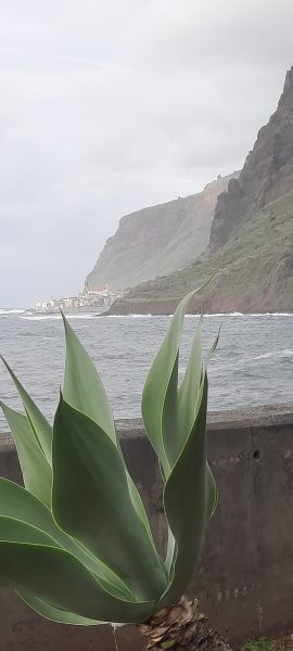Le front de mer est aménagé pour une promenade, palmiers, agaves, aloès, pelouse. Les vagues sont impressionnantes, couleur menthe glaciale. Au loin, après une haute falaise se dessine l silhouette de Paul do Mar blotti autour de sa grande église blanche.